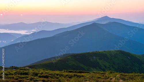 © wanna, Fototapeta premium Mountain landscape with a misty forest and a golden sunrise casting a warm glow over the peaks and valleys