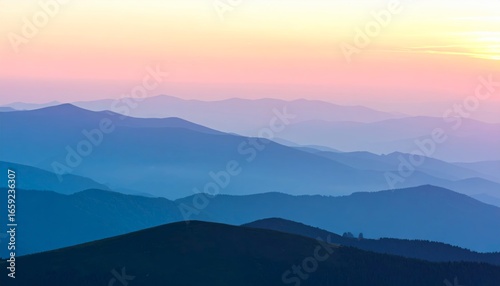 © wanna, Fototapeta premium Mountain landscape with a misty forest and a golden sunrise casting a warm glow over the peaks and valleys