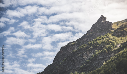 © Denis, Naklejka premium Mountain landscape with a rocky slope overgrown with vegetation against a cloudy sky in the mountains, summer landscape in the mountains