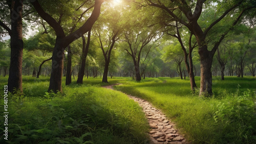 Obraz premium Mountain landscape with alpine meadow and colorful forest at sunset.