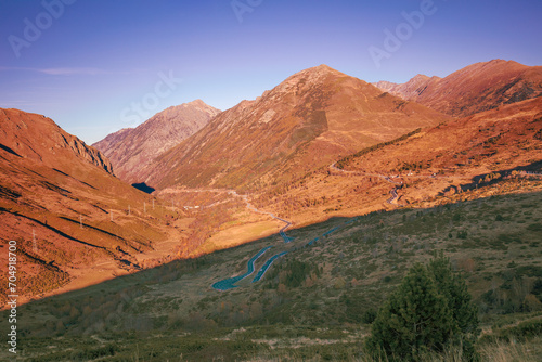 Naklejka premium Mountain landscape with blue clear sky during sunset in autumn. Hiking The Pyrenees Mountains In Andorra