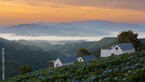 © somchairakin, Naklejka premium Mountain landscape with blue hydrangea flowers and small white houses under colorful sky at sunrise, creating peaceful and calm mood