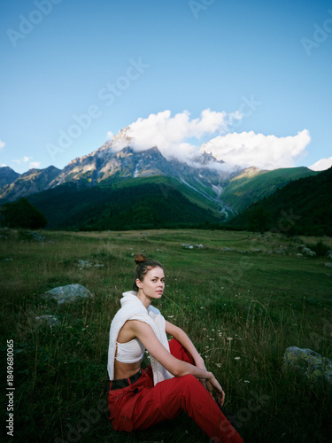 Fototapeta premium Mountain landscape with blue sky and clouds, a woman sits in a meadow wearing red pants and a white top, outdoor fashion in scenic nature.