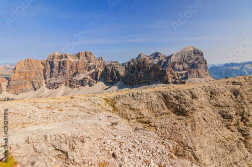 © Thomas, Fototapeta premium mountain landscape with blue sky lagazuoi dolomites world war one ruins