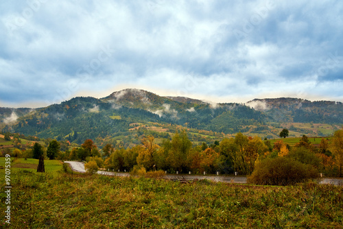 © kirill4mula, Naklejka premium Mountain landscape with clouds and colorful trees