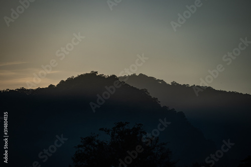 © marchsirawit, Fototapeta premium Mountain landscape with flare of the sun rise.