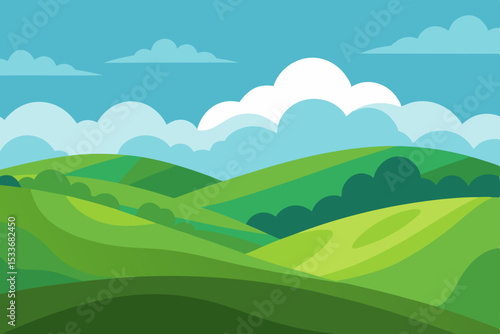 © Jibon, Fototapeta premium Mountain landscape with green fields, trees, and sky with clouds