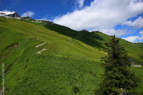 © fotorath, Fototapeta premium Mountain landscape with green meadows and sunshine