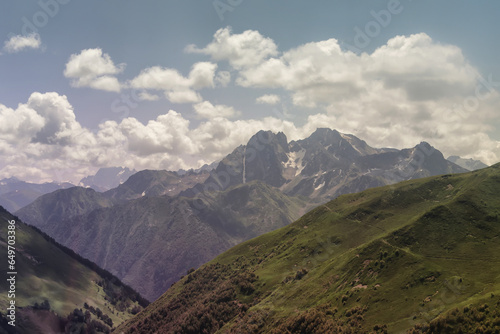 Obraz premium Mountain landscape with green slopes, cliffs, glaciers and white clouds in the sky