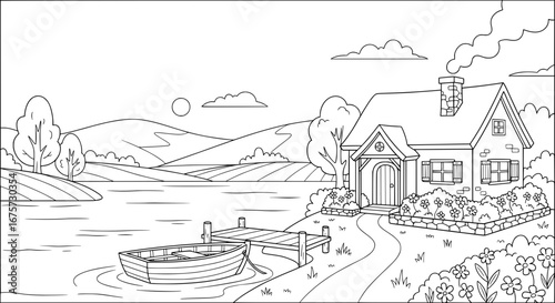 © hamzahalderad, Obraz premium Mountain landscape with house and boat with transparent background