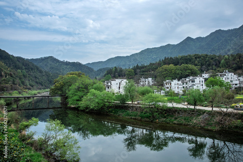 © youm, Fototapeta premium mountain landscape with lake and bridge
