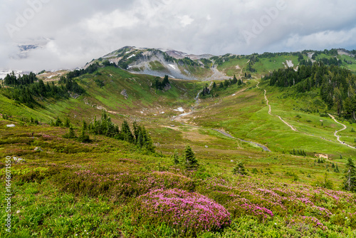 Fototapeta premium Mountain landscape with meadow. Valley landscape with cloudy sky. Scenic...