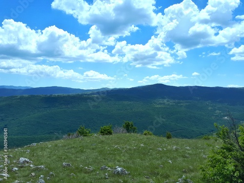 © Kenox, Fototapeta premium Mountain landscape with pine forest and clouds