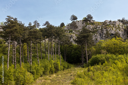 © bepsphoto, Fototapeta premium Mountain landscape with pine trees and karst rock formations