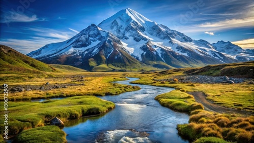 Fototapeta premium Mountain Landscape with Snow-Capped Peak and Meandering Stream