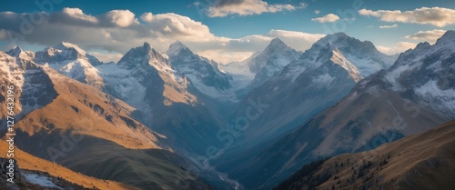 © The 2R Artificiality, Obraz premium Mountain landscape with snow-capped peaks and a valley under a blue sky with clouds at sunset in a natural environment.