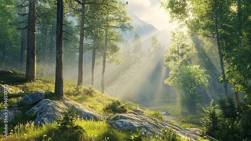 © Nasira, Obraz premium Mountain Landscape with Sun Beams in Ukrainian Carpathians