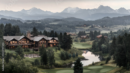© tugkiara, Fototapeta premium Mountain luxury homes, golf course, dusk. Landscapes