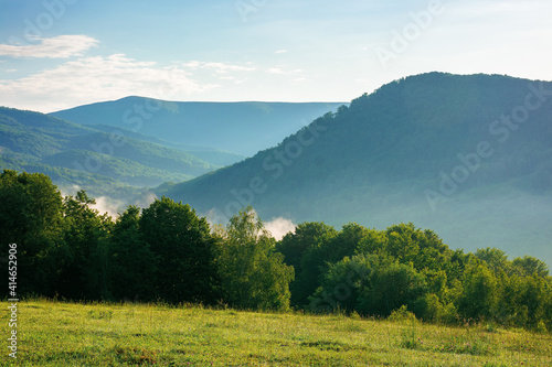 Obraz premium mountain meadow in morning light. countryside springtime landscape with valley in fog behind the forest on the grassy hill. fluffy clouds on a bright blue sky. nature freshness concept