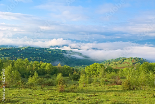 Fototapeta premium mountain meadow in morning light. countryside springtime landscape with valley in fog behind the forest on the grassy hill. fluffy clouds on a bright blue sky. nature freshness concept