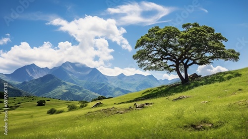 Fototapeta premium Mountain meadow one tree under mountain white top