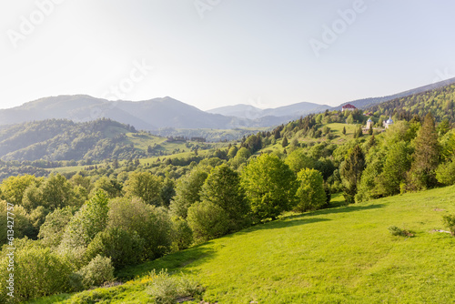 Fototapeta premium Mountain meadows and forests on Carpathian ridges in sunny weather