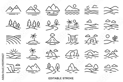 Fototapeta premium Mountain & Nature Landscape Line Icons Set Editable Stroke Vector Icons for...