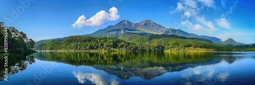 Obraz premium Mountain Panorama. Reflection of Volcanic Mountain in Calm Lake with Green Forest Surrounding