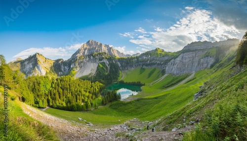 © DipetttDesign, Fototapeta premium Mountain panorama with green valley, snow-capped peaks, and cloudy sky