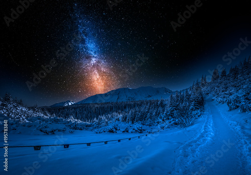 © shaiith, Obraz premium Mountain path and milky way in winter