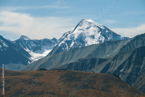 Fototapeta premium Mountain peak covered with snow. Mystical drawing of a face on the mountain.