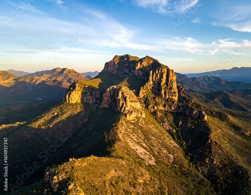 © Halal, Obraz premium Mountain peak, golden light, aerial view