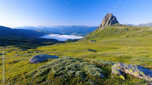 Naklejka premium Mountain peak sunrise valley fog alpine meadow