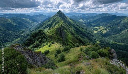 Obraz premium Mountain peak, valley, lush green slopes