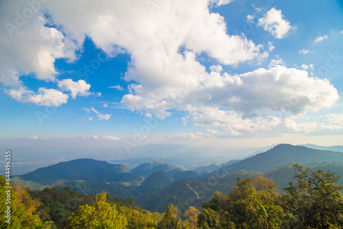 Fototapeta premium Mountain peak with grass pine forest sunset sky cloud nature landscape