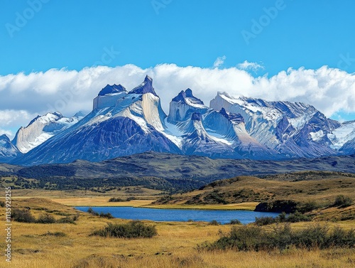© Priya, Naklejka premium mountain peaks and a lake under a blue sky