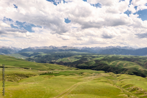 © Vink Fan, Obraz premium Mountain peaks and grassland are under white clouds.