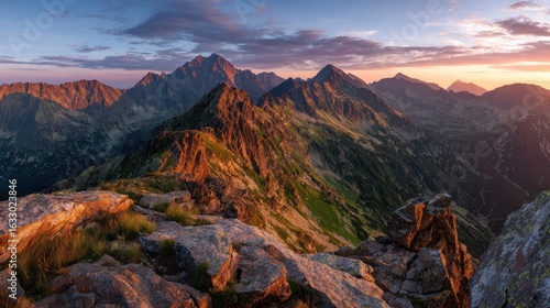 © sumi, Fototapeta premium Mountain peaks at sunset. Rocky mountain ridge at sunrise