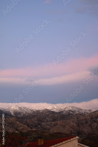 Naklejka premium Mountain peaks covered in snow and pink clouds in the sky. Beautiful winter sunset in Croatia.
