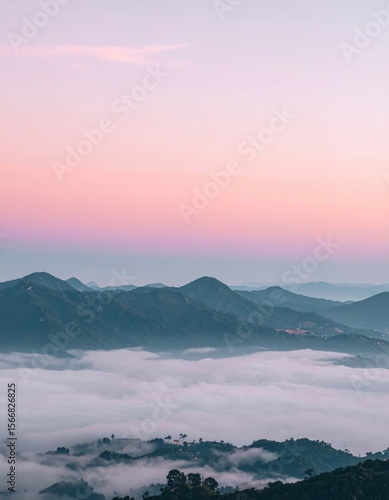 Fototapeta premium Mountain peaks emerging through a sea of clouds, pink sky