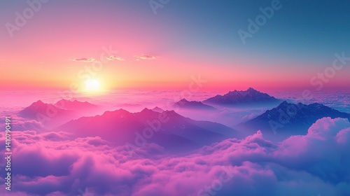 Fototapeta premium Mountain peaks pierce pink clouds under sunset's glow. Vibrant, dreamlike