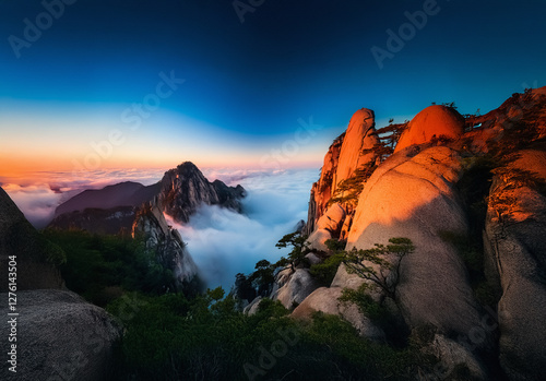 © YiuCheung, Fototapeta premium Mountain peaks pierce through clouds at sunset. Golden light bathes rocky slopes as the sky blends blue and orange hues. A scenic, tranquil vista.