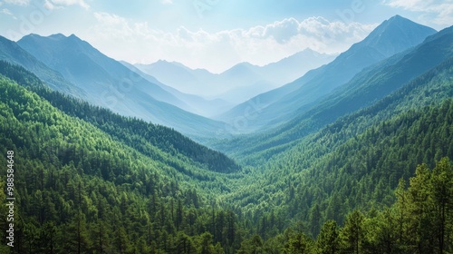 Fototapeta premium Mountain peaks towering above a dense forest, with a serene valley in...