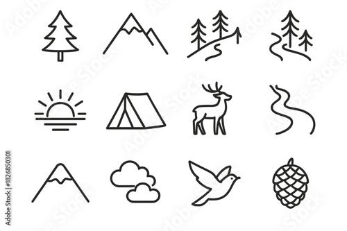 © Svitlana, Fototapeta premium Mountain Pine Icons. Mountain pines. Line icon set of mountain pines: pine tree, mountain peak, forest slope, hiking path, sunrise, tent, deer, river line,