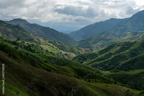 © Puwaphat, Fototapeta premium mountain range and dramatic clouds view from airplane (Nan province, Thailand). amazing natural landscape. popular attractions best famous tourist attractions