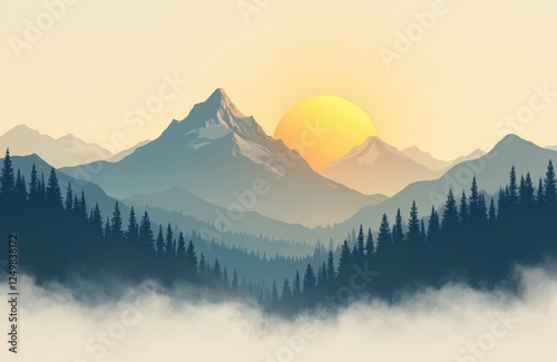 © Maryna, Obraz premium Mountain range at dawn. Peaks illuminated by sunrise. Soft pastel colors in sky. Foggy valley below. Peaceful landscape. Nature scene. Inspiring image. Serene morning. Majestic mountain range. Forest