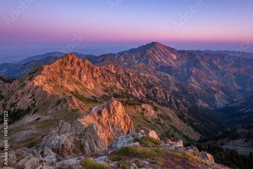 © Indra, Fototapeta premium Mountain range at dawn. Rocky peaks bathed in sunrise colors