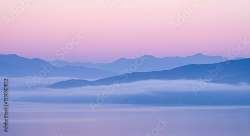 © Aklima, Fototapeta premium Mountain range at dawn with fog and pastel colored sky in a scenic landscape