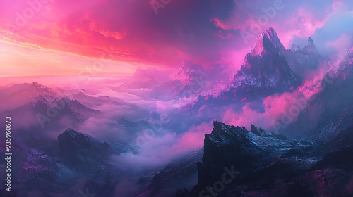 © Arbystudio, Obraz premium Mountain Range at Sunset with Pink and Blue Hues