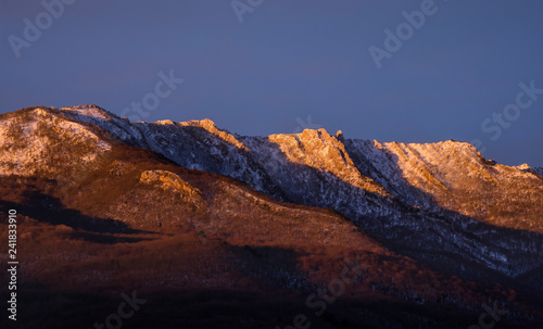 © valeie, Naklejka premium mountain range illuminated by the rising sun